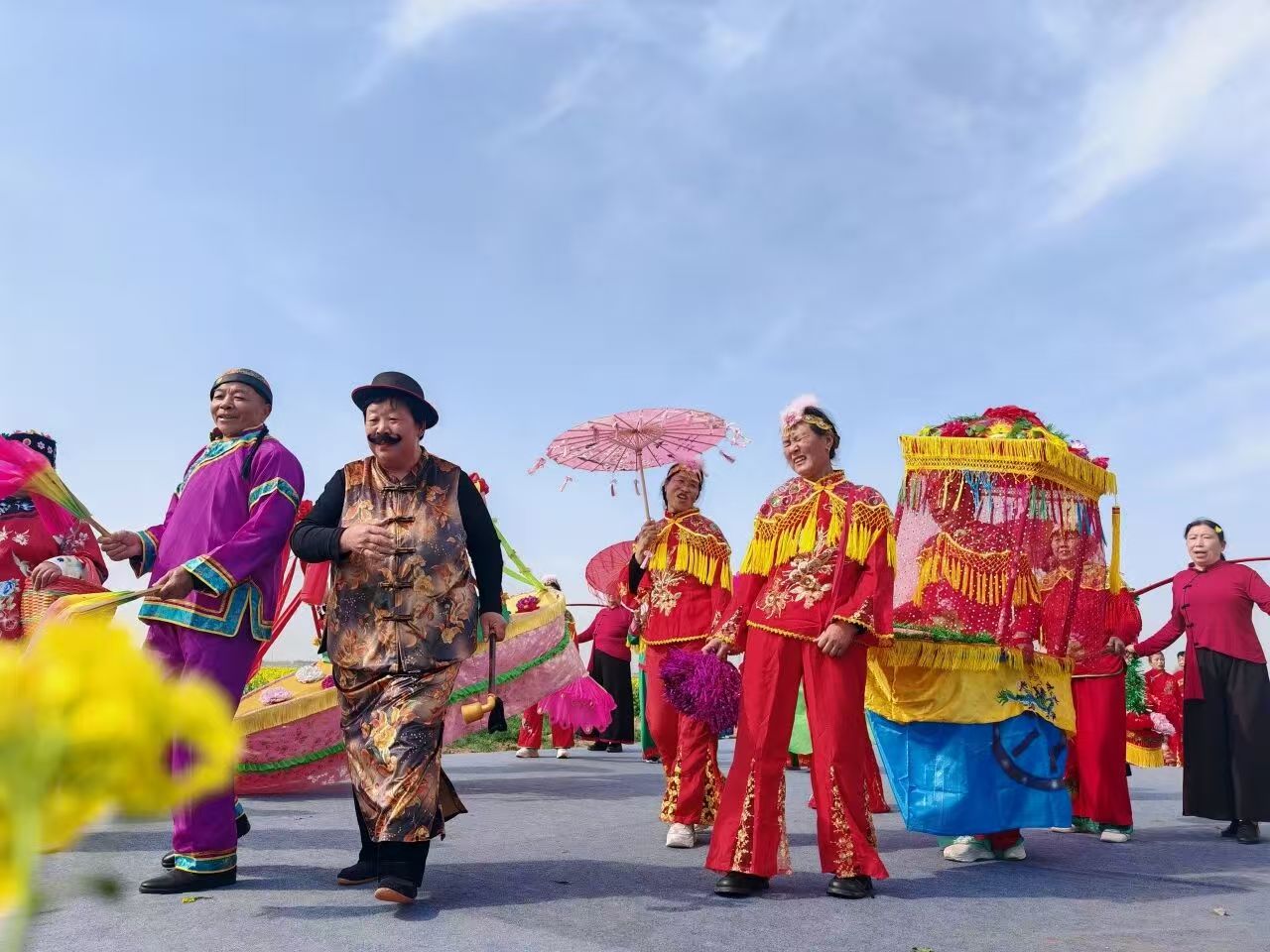 舞龙、划旱船等冀南特色非遗表演在花海中轮番上演,演员们身着传统服饰,在金黄花海映衬下灵动起舞,色彩鲜艳的长龙灵活穿梭,铿锵锣鼓声与阵阵喝彩声交织,让游客在赏花踏青之余,沉浸式解锁春日游玩新体验。